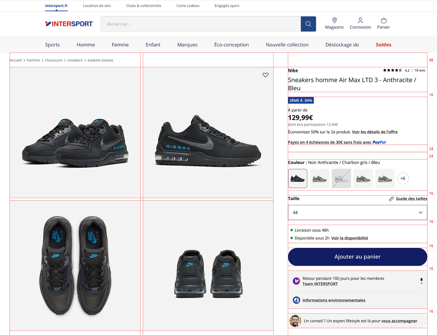 Visionnées quotidiennement par des milliers d’utilisateurs, les pages produits du site marchand d’Intersport sont avant tout des moyens de faciliter l’achat. Enlever le maximum de friction ou donner un maximum d’informations sur le produit : elles doivent donner une réponse à toutes les questions que se pose le futur acheteur.